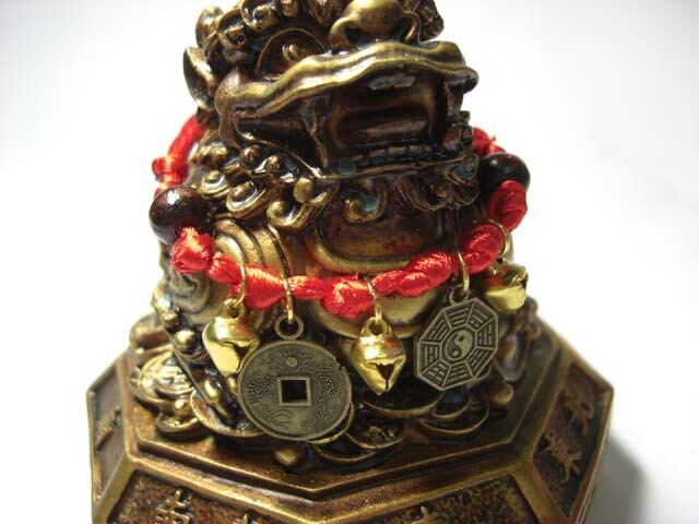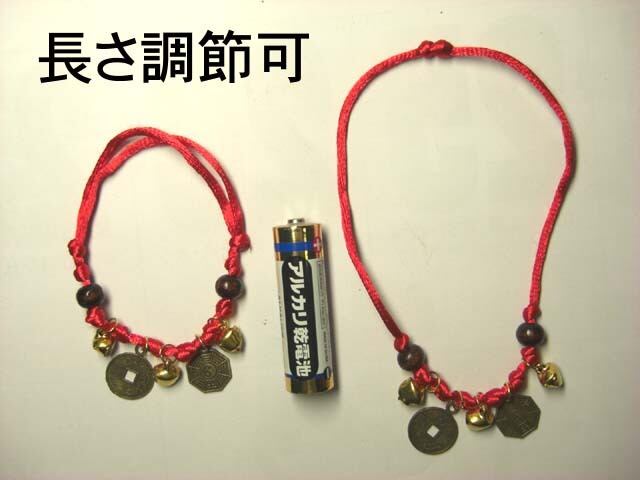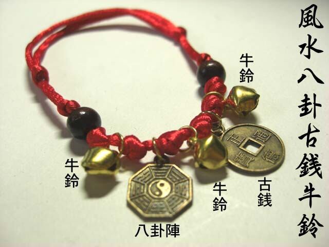 ヒキュウの目を覚ます牛鈴が3つ、そのほかに開運八卦陣、風水古銭が付いて、縁起の良い赤いヒモで結んだ最強の首飾りです。