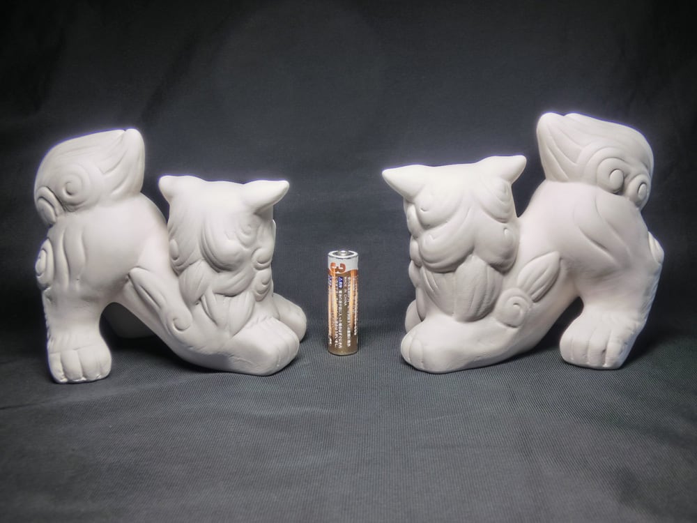 可愛らしい表情の寝そべりシーサー 1対セット(素焼き陶器)です。