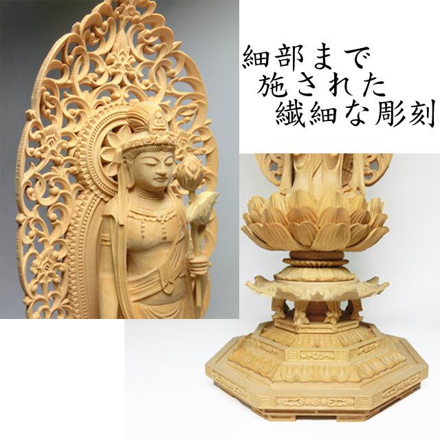その適度な硬さ故に非常に細やかな表現が可能となり、観音様のお顔や台座に施された繊細な彫刻が実に見事な逸品です。