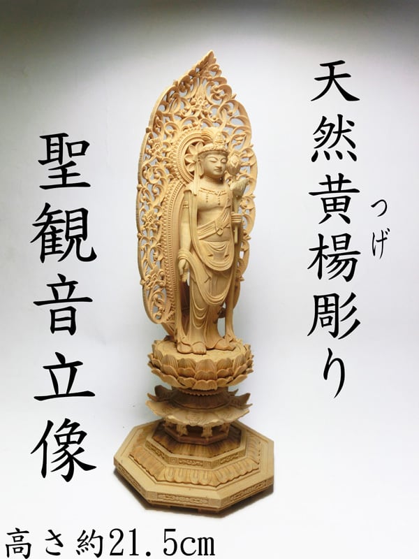 天然 黄楊 (ツゲ)彫り 聖観音 菩薩像 立像 (H約21.5cm)<仏像・風水開運置物・幸運置物> 天然木 柘植 ( つげ )製彫刻