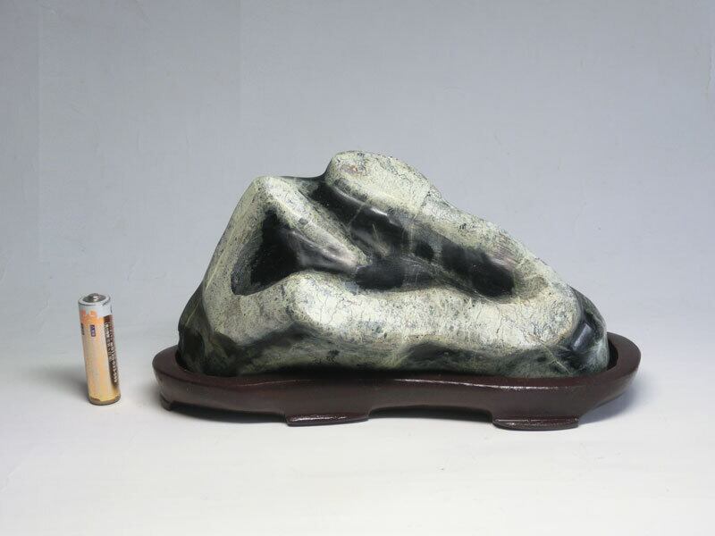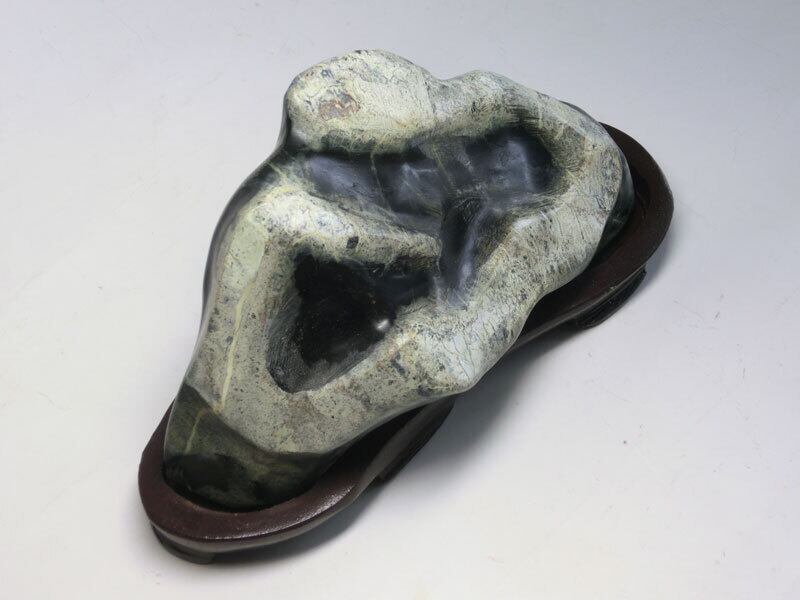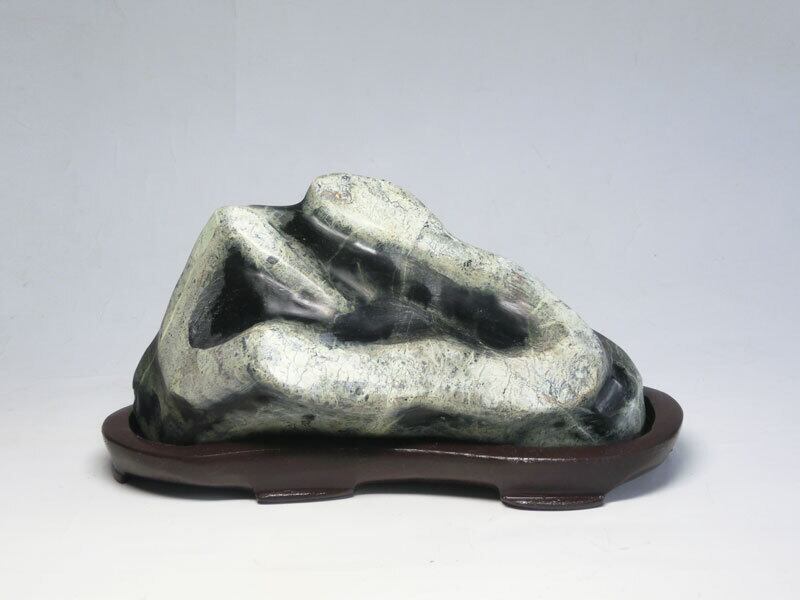 原石は“蛇紋石(じゃもんせき)”と呼ばれる石で、長い年月の中で風化した表面の白い部分を蛇の形に似せて削り出したもので、塗装などではなく天然の石です。