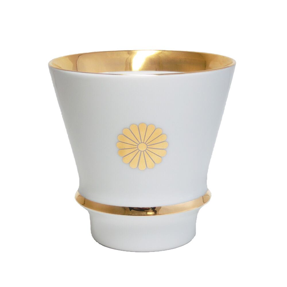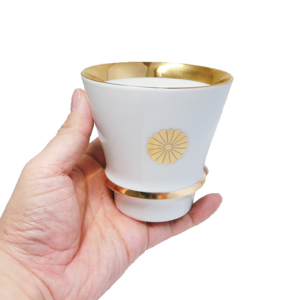格調の高い菊のご紋のデザインをあしらった 日本製 有田焼 の慶祝 SAKE カップ (桐箱入り)です。