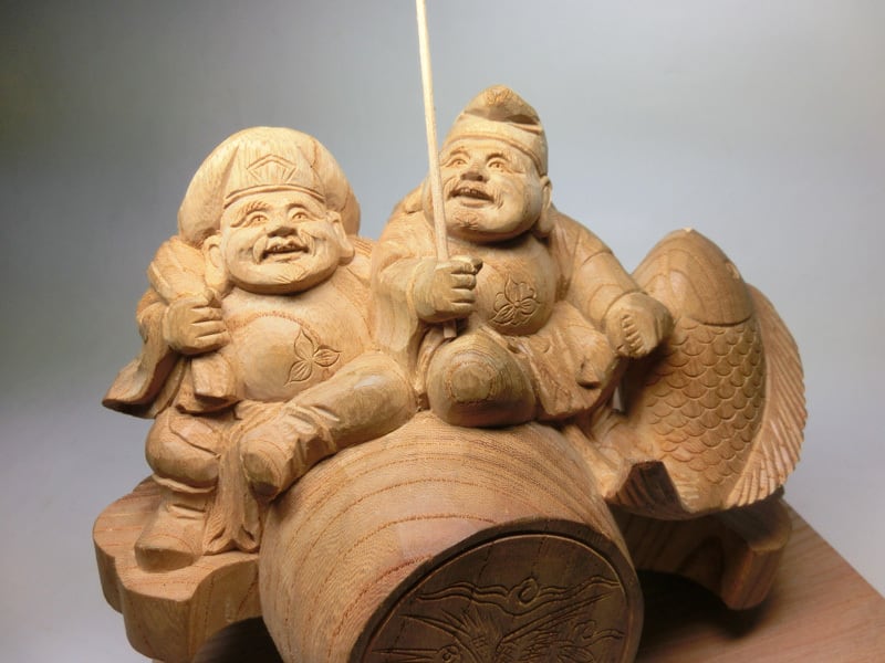 天然木ケヤキを彫刻した笑顔溢れる表情の大黒様と恵比寿様の置物です。