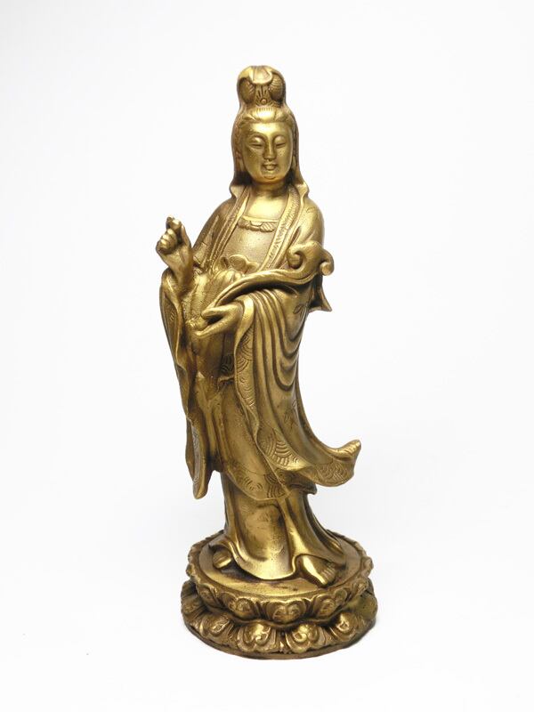 願いを実現する力があると云われる如意棒を手に持つ、 ズッシリとした重さの安定感のある如意聖観音様の立像(金属製)です。
