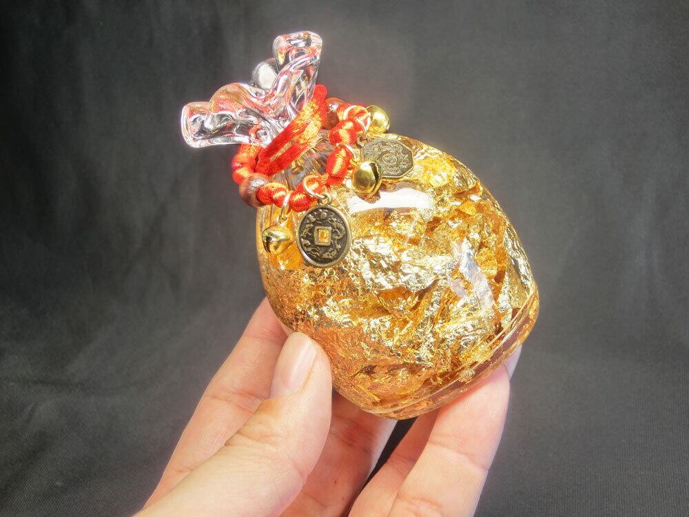 台座となるガラス製の福笹船は不思議で神秘的な金色で、クジ券の上に置くペーパーウェイトの役割の宝袋は、内部に金箔がふんだんに封入され、いかにも運気が高まって行きそうです♪