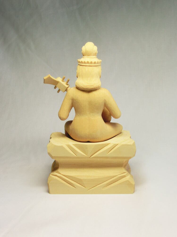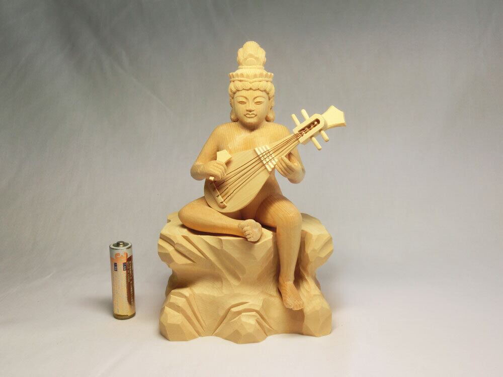 ヒノキ製の台座に乗り、琵琶を奏でる弁才天製の様の置物です。