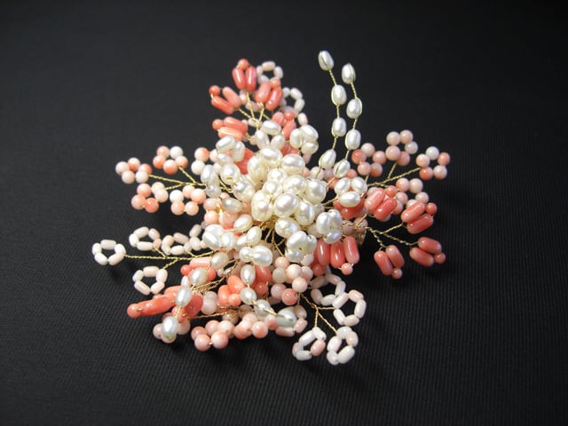 白色珊瑚、桃色珊瑚、淡水真珠で作られた豪華で可愛らしいコサージュです。