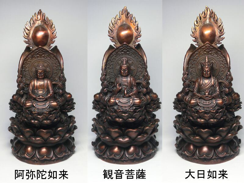 三尊仏 座像 阿弥陀如来 観音菩薩 大日如来( 金属製 )高さ約25.5cm<仏像・風水置物・開運置物・幸運置物> 阿弥陀仏坐像 大日如来様 白衣観音 八体仏 八大仏 守り本尊 守護本尊