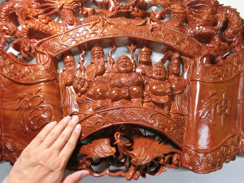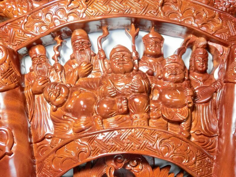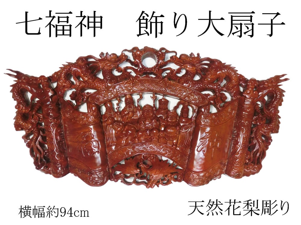 【現品限り】天然 花梨彫り 七福神 飾り扇子 <仏像・開運縁起物・幸運置物> 大扇子 七福神の置物 大黒様の置物 かりん