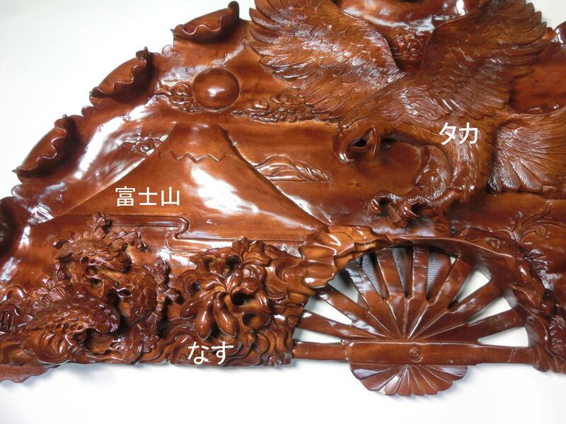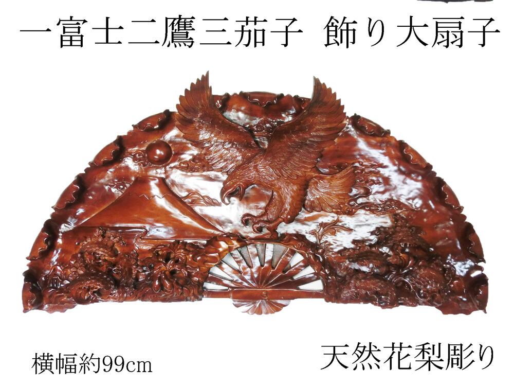 【現品限り】天然 花梨彫り 一富士二鷹三茄子 飾り扇子 <仏像・開運縁起物・幸運置物> 大扇子 扇の置物 置物 かりん